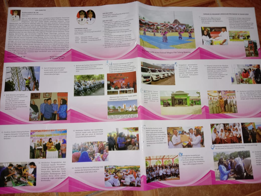 Brosur yang di keluarkan Badan Perencaan dan Pembangunan Daerah (Bapleda) Kabupaten Tulang Bawang, sumber informasi capaian kinerja Bupati Kabupaten Tulang Bawang yang tidak sesuai dengan fakta program Kerja (Pokja) yang bergulir.