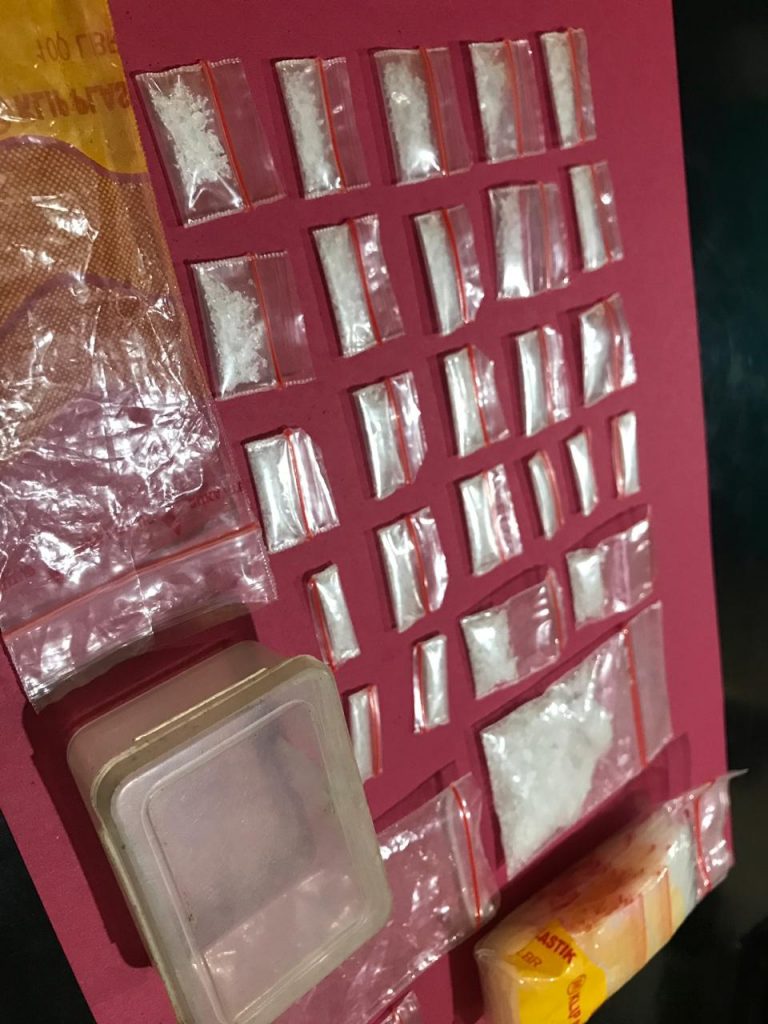 Dari tangan tersangka diamankan barang bukti 25 paket kecil dalam pelastik yang diduga kuat barang tersebut adalah sabu, 1 paket sedang sabu, 1 bundel plastik klip, 1 buah kotak kecil plastik bening dan 1 unit hendpone merk samsung warna putih.