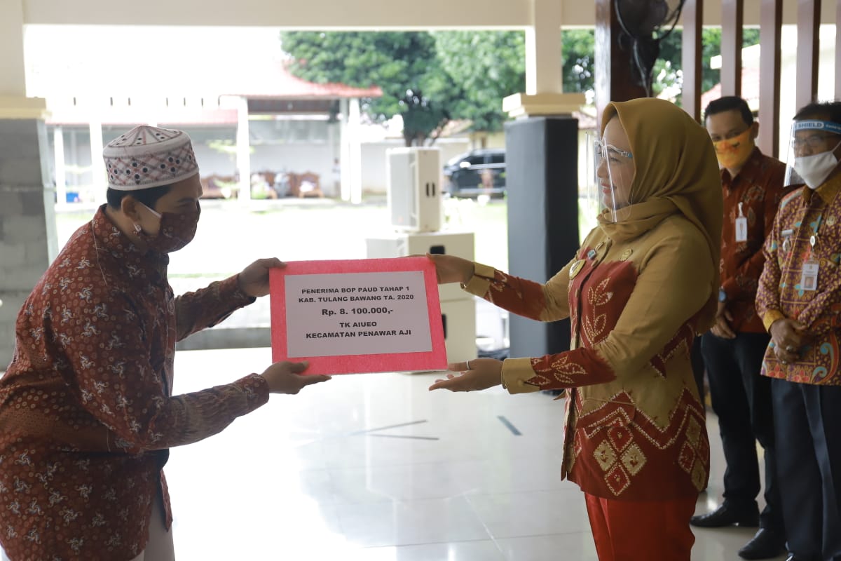Gerbang1news.com, Tulang Bawang – Sebanyak 238 PAUD di Kabupaten Tulang Bawang menerima bantuan operasional penyelenggara (BOP) tahap I. Penyerahan bantuan tersebut dilakukan langusng oleh Bupati Tulang Bawang Winarti kepada perwakilan guru PAUD di rumah dinas bupati, Jumat (3/7/2020).