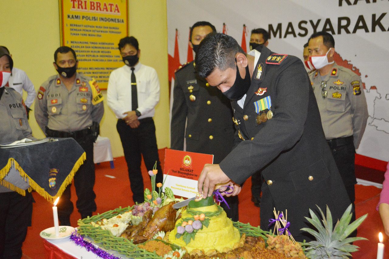 “Hal ini dilakukan, untuk mencegah penyebaran covid-19 yang sampai saat ini vaksinya belum ditemukan dan memberikan contoh yang baik dalam penerapan kehidupan new normal. Tema yang diusung dalam Peringatan Hari Bhayangkara Ke-74 kali ini adalah Kamtibmas Kondusif Masyarakat Semakin Produktif.” tambahnya.