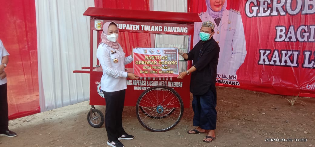 Selanjutnya penyerahan gerobak dorong bagi pedagang kaki lima kuliner Kecamatan Menggala, Dente Teladas, Banjar Agung, Penawar Aji dan Penawar Tama, dengan total bantuan 20 unit gerobak dorong bagi UMKM.