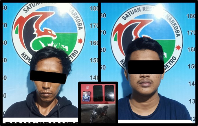 Kasat Narkoba Polres Metro IPTU Hendra Abdurachman, S.Sos mewakili Kapolres Metro AKBP Heri Sulistyo Nugroho, S.IK., M.IK mengatakan bahwa keduanya ditangkap Sat Narkoba Polres Metro pada hari Selasa tanggal 02 Juli 2024 sekira jam 16.30 WIB saat melintas di Jalan Jendral Sudirman Kelurahan Ganjar Agung Kecamatan Metro Barat Kota Metro.